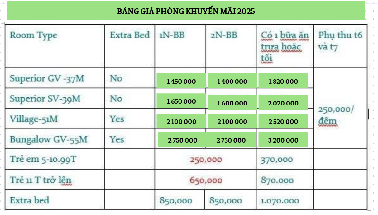 * Từ 11 tuổi trở lên được tính như người lớn => phụ thu 1.400.000 (không bao gồm giường)