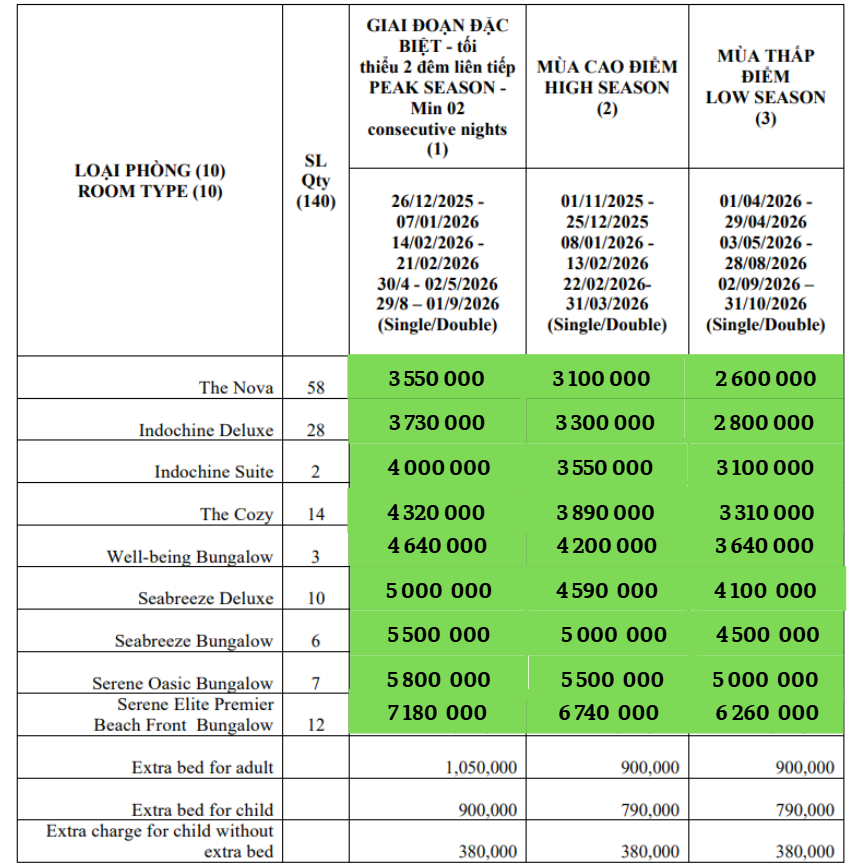 Các bungalow và phòng nghỉ được thiết kế tinh tế, đầy đủ tiện nghi, view hướng biển .