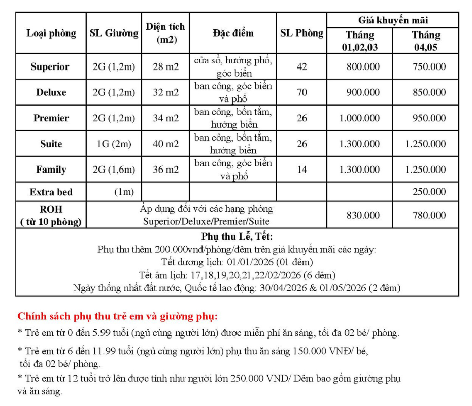 BẢNG GIÁ PHÒNG DL YẾN VIỆT KM 2026