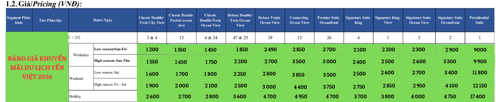 GIÁ PHÒNG 2026