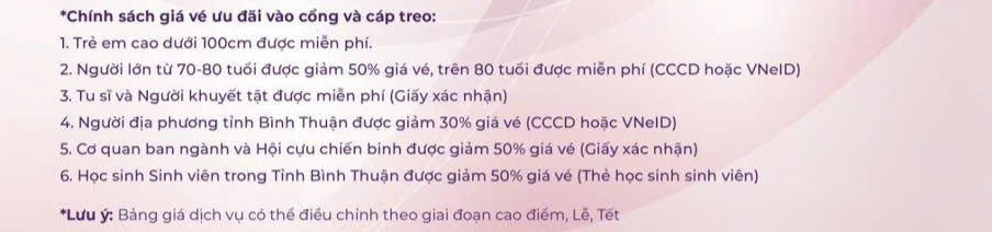 ⇨ Cáp treo: Trẻ em dưới 1m miễn phí; dưới 1,4m tính giá trẻ em ⇨ Phụ thu 10 % trên giá thực đơn khi đoàn đặt ăn dưới 10 suất.