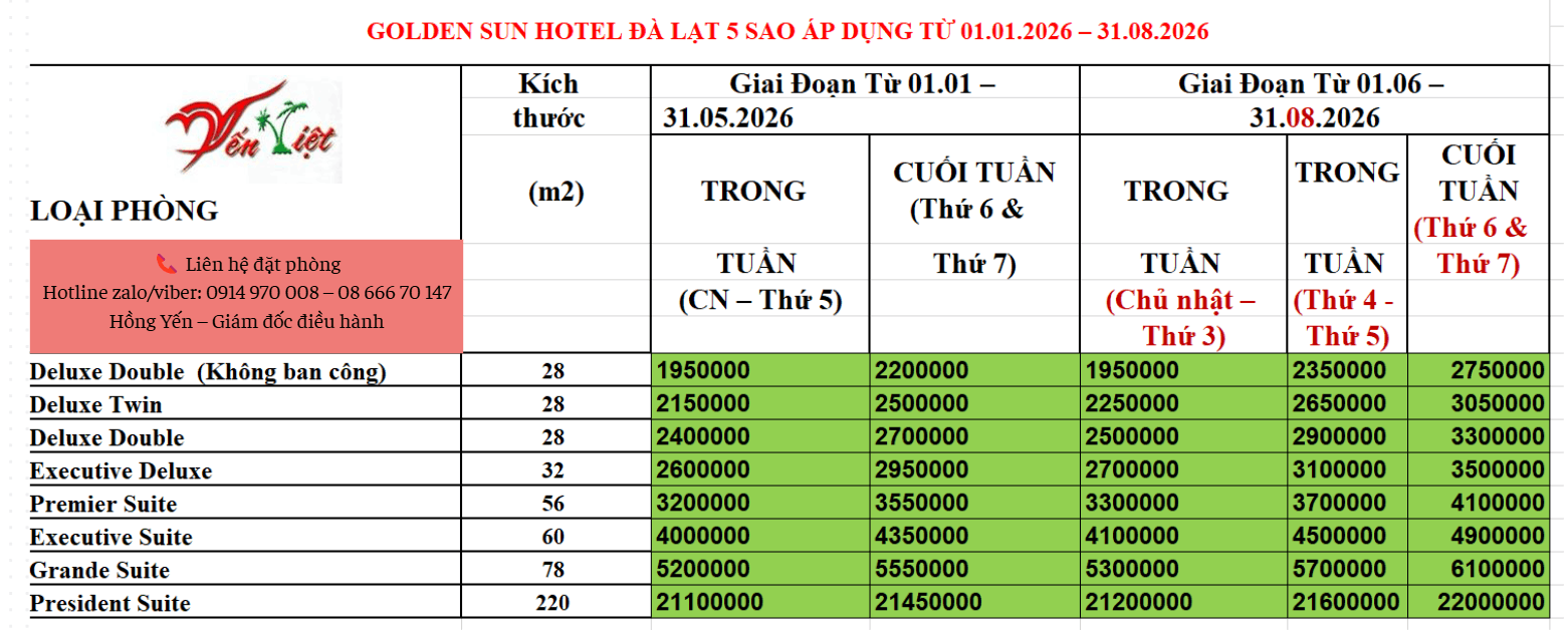 GOLDEN SUN HOTEL ĐÀ LẠT 5 SAO – BẢNG GIÁ PHÒNG 2026