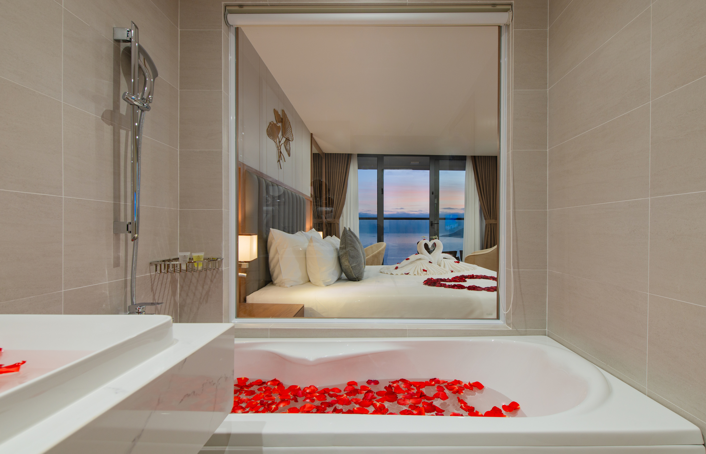 Phòng Premier Deluxe Ocean View : Hướng trực diện biển – Ban công – Bồn tắm.