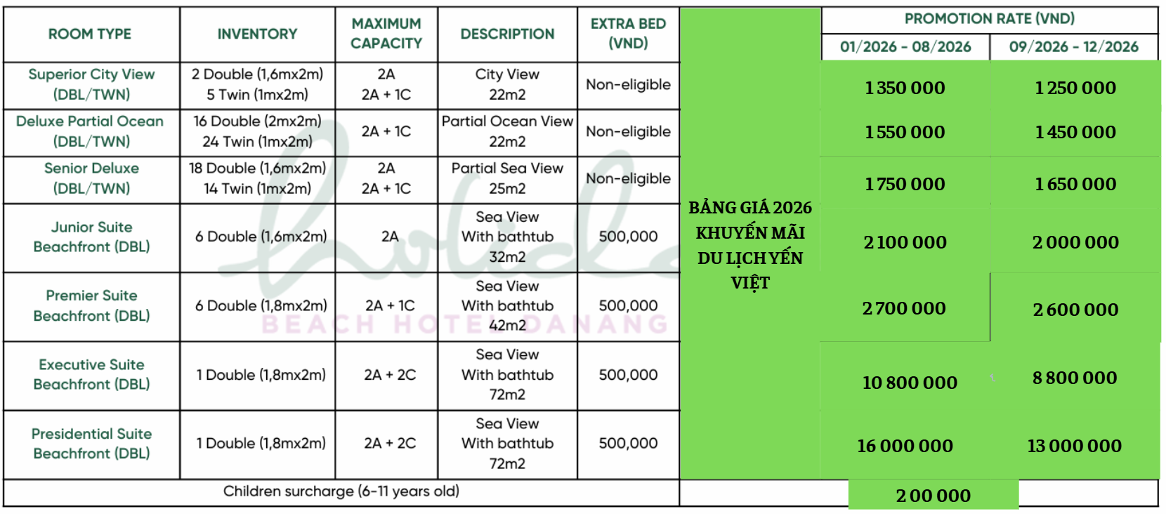 💰 Từ hạng phòng Junior trở lên: 500.000 VND / phòng / đêm.