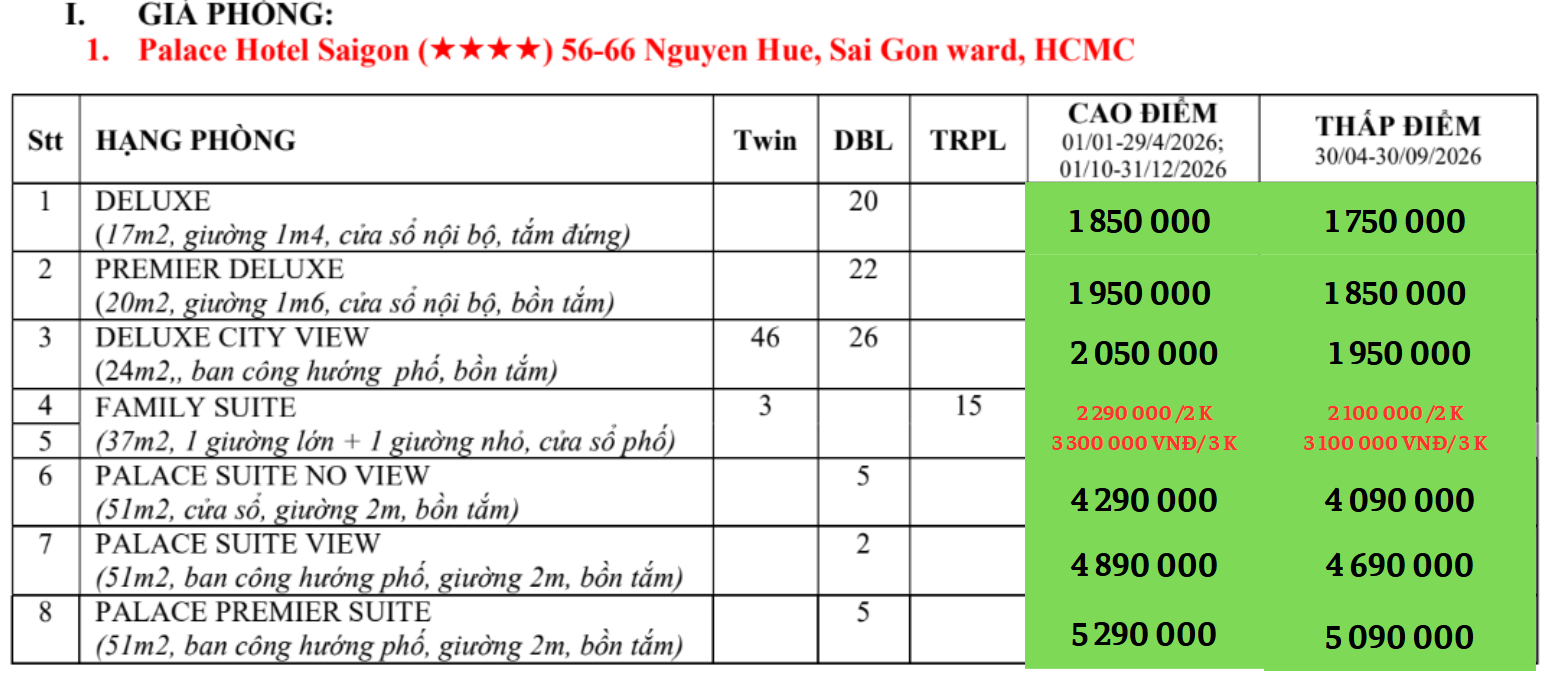 PALACE HOTEL SAIGON 4 SAO GIÁ PHÒNG KM HOT
