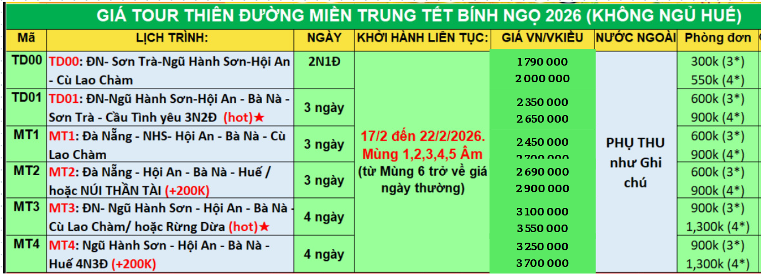 Trang chủ Du Lịch Miền Trung Tour Đà Nẵng Tour Đà Nẵng 3 ngày 2 đêm ghép lẻ khởi hành hằng ngày