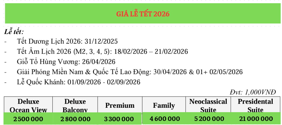(bao gồm ăn sáng, không kê thêm giường, tối đa 01 trẻ ngủ chung giường với bố mẹ).